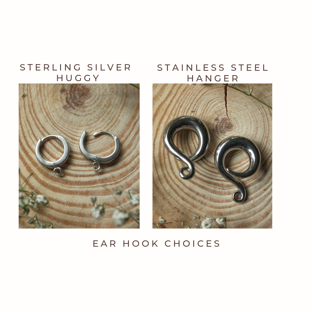 Gauged ears? No problem! I am happy to swap the ear hooks to a sterling silver huggy, or stainless steel hangers. Just choose your preference at the top of the page before checking out. Please refer to images to see your choices.