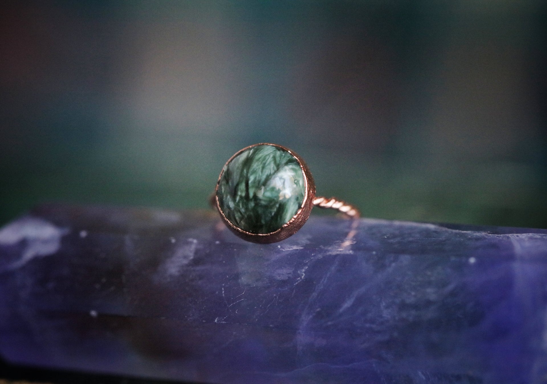 Invoke your devine feminine energy with this seraphinite ring. Named after the angel wing like inclusions in the stone, seraphinite is a naturally occurring and gorgeous crystal. Set into a shiny copper band, the deep green contrasts beautifully, making the feathery formations catch your eye.